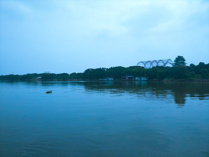 下到渡口,大王洲盎然的綠意隔江在望。雖已立冬,徐來的江風依然熏暖如春。一艘渡輪在江兩岸來回行駛,擺渡過江的人。只見渡輪先從渡口向江心斜行,越過江心之后,船尾開始發(fā)力,以船頭為支點,劃了個半圓。原來它要做個漂移。憑著舵手嫻熟的技術,時機得當?shù)陌盐?,渡輪不偏不倚地??吭诙煽谶吷?。讓初來乍到的我們領略到了這次活動給我們的番驚喜。